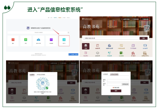 輸入網(wǎng)址http://xuanshu.hep.com.cn/,進(jìn)入“產(chǎn)品信息檢索系統(tǒng)”首頁,點(diǎn)擊右側(cè)“電子書”模塊,進(jìn)入電子書界面,點(diǎn)擊右上角“登錄/注冊”按鈕,選擇“掃碼登錄”或“手機(jī)驗(yàn)證碼登錄”。①“掃碼登錄”操作步驟:通過微信“掃一掃”掃描頁面上的小程序碼,新用戶登錄請點(diǎn)擊微信界面“微信授權(quán)”→“允許”高教社用戶中心申請→“授權(quán)使用手機(jī)號”→“允許”高教社用戶中心使用→“確認(rèn)登錄”;老用戶直接點(diǎn)擊微信界面的“確認(rèn)登錄”。