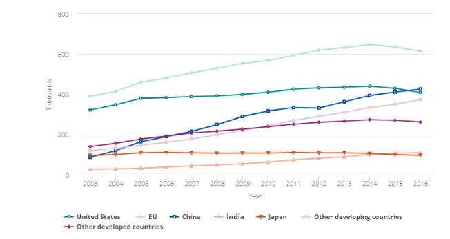 圖一是STEM教育在不同的國家的發(fā)展折線圖。我們看到桔紅的線和深藍色的線,向上走的都是像中國以及印度這樣一些國家,那么我們可以看到根據(jù)教育的研究,這些國家他們都是目前發(fā)展非??斓膰?,他們非常關注STEM的發(fā)展。
