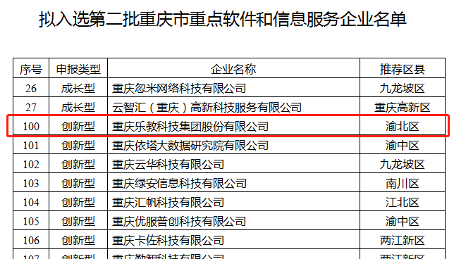 喜報(bào)l重慶樂教科技集團(tuán)入選“第二批重慶市重點(diǎn)軟件和信息服務(wù)企業(yè)名單”