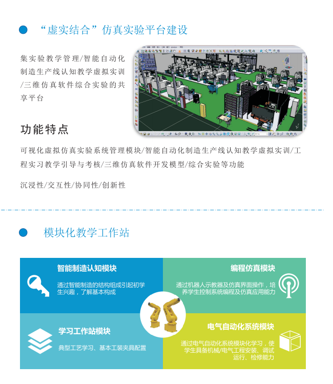 針對智能制造教育,為高等院校/中職院校全力打造智能制造創(chuàng)新教學(xué)體系建設(shè)(專業(yè)建設(shè)/師資培養(yǎng)/教學(xué)管理服務(wù)/資格證書認(rèn)定/協(xié)同創(chuàng)新教學(xué)環(huán)境搭建);提供“1:1智能工廠”實(shí)驗(yàn)室/“虛實(shí)結(jié)合”仿真實(shí)驗(yàn)平臺/數(shù)字資源及現(xiàn)代應(yīng)用技術(shù)實(shí)驗(yàn)室建設(shè),實(shí)現(xiàn)從虛擬到現(xiàn)實(shí)的智能制造實(shí)訓(xùn)教學(xué)平臺。
