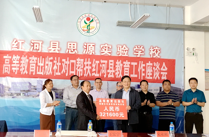 在紅河調(diào)研期間,還舉行了捐贈(zèng)儀式。高教社向紅河縣捐贈(zèng)總計(jì)65萬(wàn)元的資金和圖書(shū)、以及300臺(tái)電腦,用于改善紅河縣基礎(chǔ)教育設(shè)備設(shè)施;向思源實(shí)驗(yàn)學(xué)校捐贈(zèng)32萬(wàn)余元,用于購(gòu)買課桌椅、雙層床架和教學(xué)設(shè)備;代表高教社員工向紅河縣紅十字會(huì)捐贈(zèng)10.4萬(wàn)元,作為120名貧困學(xué)生助學(xué)款。高教社全體員工,用一片愛(ài)心,一份熱誠(chéng),助力紅河脫貧攻堅(jiān)任務(wù),一起迎接美好的明天。