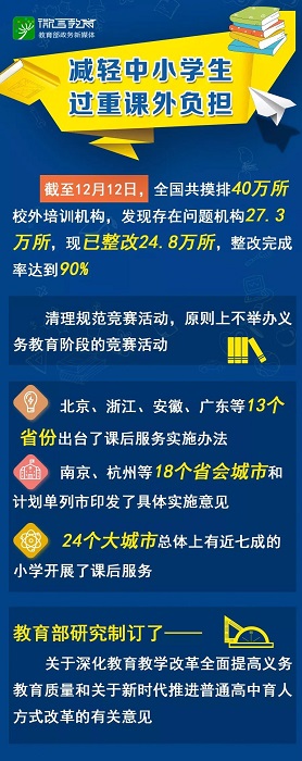 為推進綜合治理,教育部正會同有關(guān)部門研究制定中小學(xué)生綜合減負措施,明確各方責任,形成政府、學(xué)校、校外培訓(xùn)機構(gòu)、家庭協(xié)同推進減負工作合力。呂玉剛表示,下一步,要進一步加大校外培訓(xùn)機構(gòu)治理力度,切實解決校外培訓(xùn)機構(gòu)存在安全隱患、無證無照、超標超前教學(xué)等突出問題,確保年底前完成集中整改工作。在此基礎(chǔ)上,強化督導(dǎo)檢查,鞏固治理成果,堅決防止反彈,建立健全校外培訓(xùn)機構(gòu)規(guī)范有序發(fā)展的長效機制,使校外培訓(xùn)走上制度化、規(guī)范化管理軌道,真正成為學(xué)校教育的有益補充,促進中小學(xué)生全面健康發(fā)展。