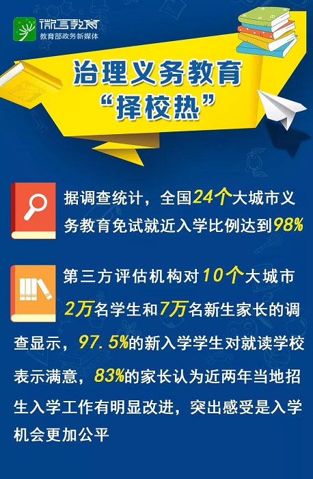2018年全國24個大城市義務(wù)教育免試就近入學(xué)比例達到98%。