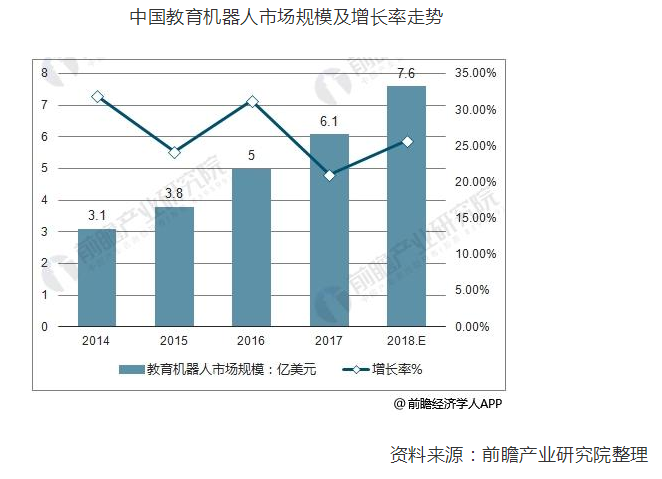 據(jù)前瞻產(chǎn)業(yè)研究院發(fā)布的《中國(guó)教育機(jī)器人行業(yè)發(fā)展前景預(yù)測(cè)與投資規(guī)劃分析報(bào)告》數(shù)據(jù)顯示,2017年中國(guó)教育機(jī)器人市場(chǎng)規(guī)模為6.1億元,同比增長(zhǎng)21.1%,隨著國(guó)家政策大力扶持人工智能中小學(xué)落地,預(yù)計(jì)中國(guó)教育機(jī)器人市場(chǎng)將持續(xù)穩(wěn)定增長(zhǎng),預(yù)計(jì)2018年中國(guó)教育機(jī)器人市場(chǎng)規(guī)模將達(dá)到7.6億元,增長(zhǎng)率為25.8%。