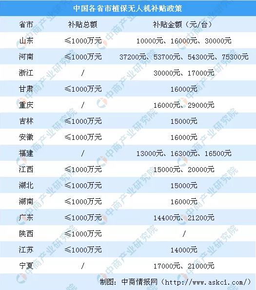 目前,進(jìn)入補(bǔ)貼試點的省市已有浙江、安徽、江西、湖南、廣東、重慶、吉林、福建、甘肅、江蘇等十余個省市。在整體試點資金安排上,基本為千萬元量級。政策支持下植保無人機(jī)市場在全國就進(jìn)入快速發(fā)展期。