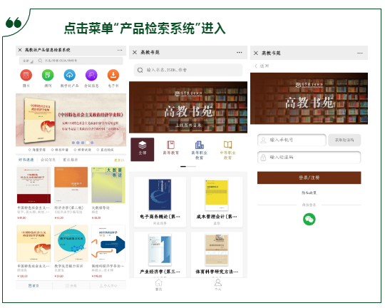 輸入網(wǎng)址http://xuanshu.hep.com.cn/,進(jìn)入“產(chǎn)品信息檢索系統(tǒng)”首頁(yè),點(diǎn)擊右側(cè)“電子書”模塊,進(jìn)入電子書界面,點(diǎn)擊右上角“登錄/注冊(cè)”按鈕,選擇“掃碼登錄”或“手機(jī)驗(yàn)證碼登錄”。①“掃碼登錄”操作步驟:通過(guò)微信“掃一掃”掃描頁(yè)面上的小程序碼,新用戶登錄請(qǐng)點(diǎn)擊微信界面“微信授權(quán)”→“允許”高教社用戶中心申請(qǐng)→“授權(quán)使用手機(jī)號(hào)”→“允許”高教社用戶中心使用→“確認(rèn)登錄”;老用戶直接點(diǎn)擊微信界面的“確認(rèn)登錄”。