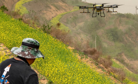 2023年4月20日,在河南三門峽市湖濱區(qū)黃河沿岸,山水林田湖草沙綜合治理開發(fā)項目的萬畝山坡梯田里,一架無人機正在為千畝油菜植保作業(yè)。谷雨時節(jié),當?shù)厝罕姺e極開展春種春管,確保今年農(nóng)業(yè)增產(chǎn)增收。(杜杰攝/光明圖片)